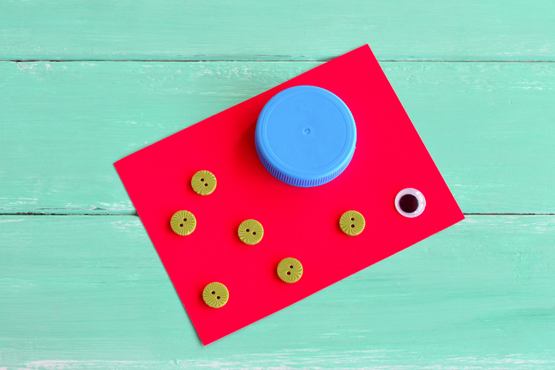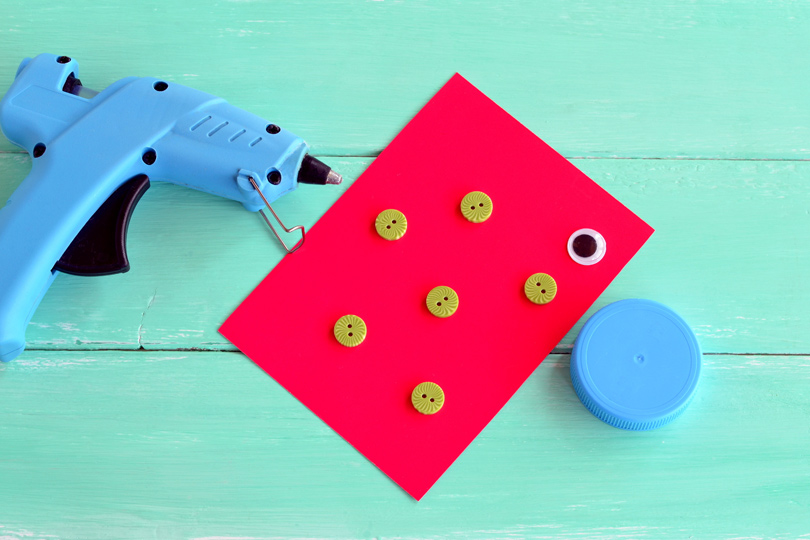 > Πίσω από το καπάκι κολλήστε τα κουμπιά σε τριγωνικό σχήμα για να δημιουργήσετε την ουρά του.