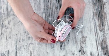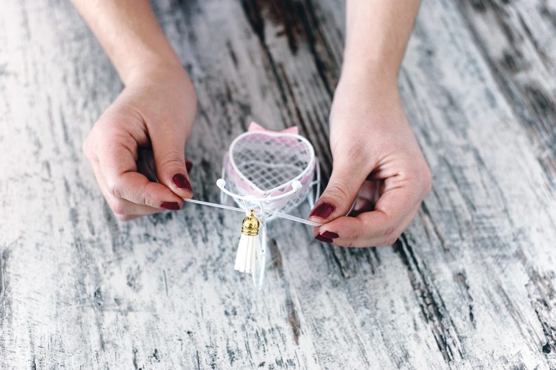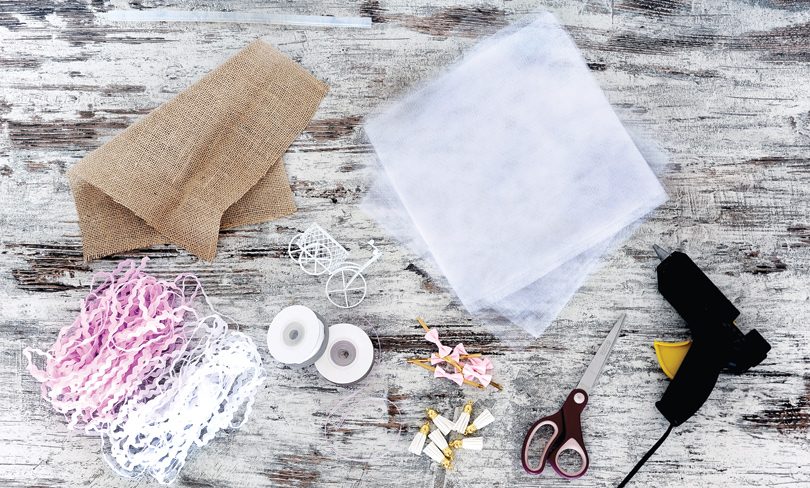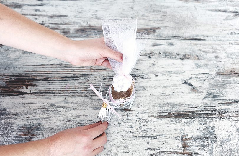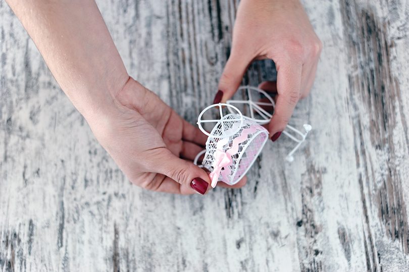 > Τοποθετήστε τα κουφέτα μέσα στο τούλι, δέστε το με τη ροζ κορδέλα και τοποθετήστε το στο ποδηλατάκι.