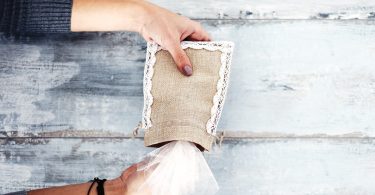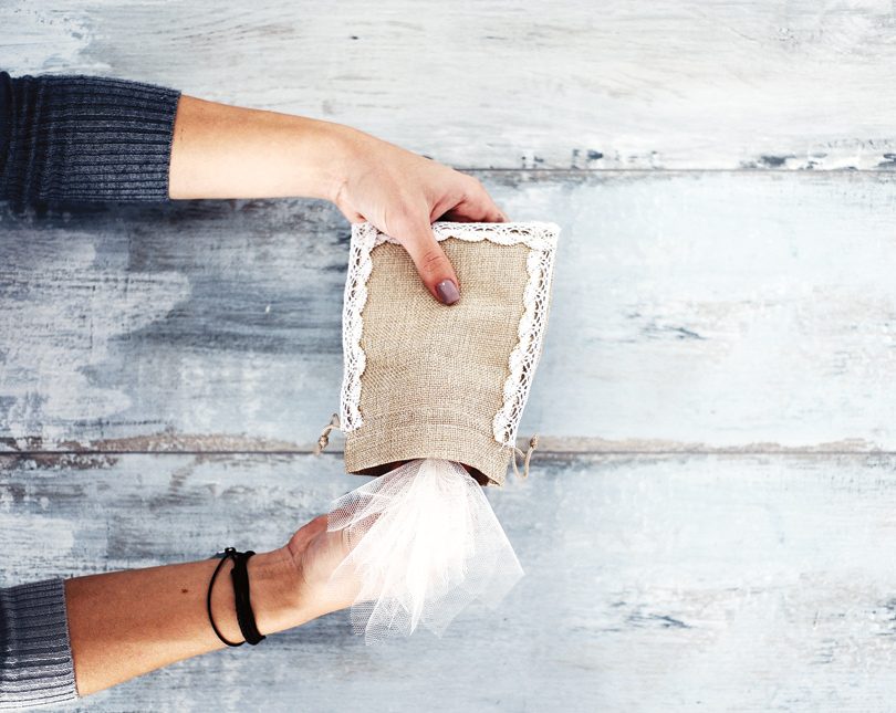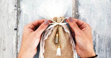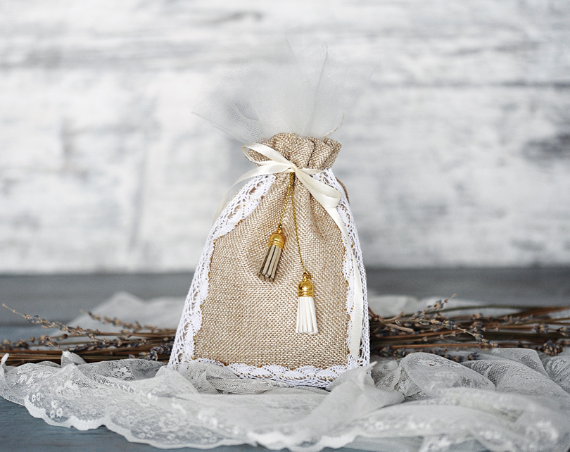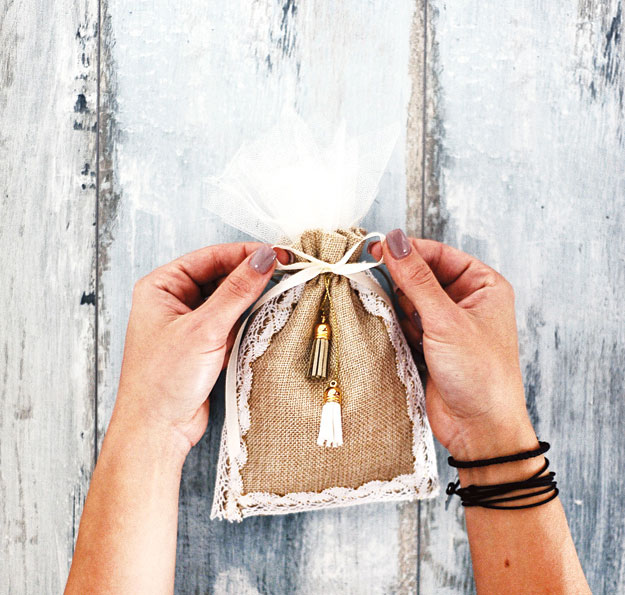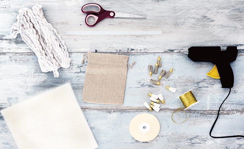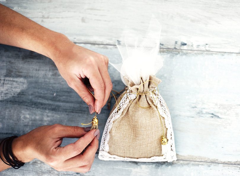 > Χρησιμοποιήστε το χρυσό κορδόνι διακόσμησης για να δέσετε το πουγκί και για να κρεμάσετε τα φουντάκια.