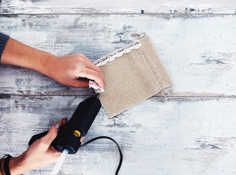 > Κόψτε τη δαντέλα σε τρία ίσα μέρη και εφαρμόστε τα περιμετρικά του πουγκιού χρησιμοποιώντας σιλικόνη.