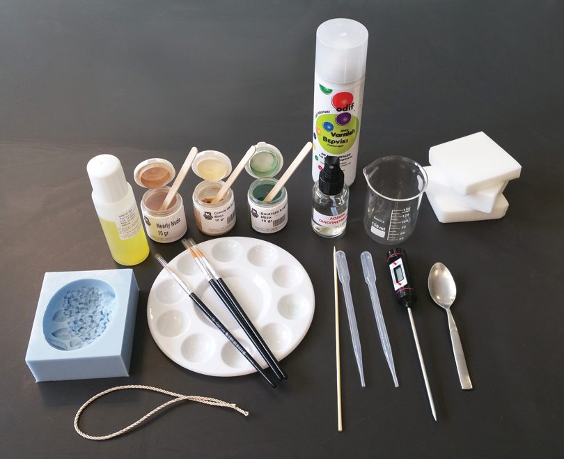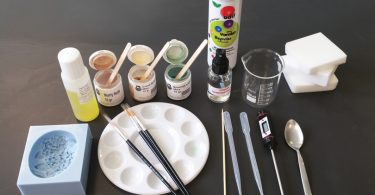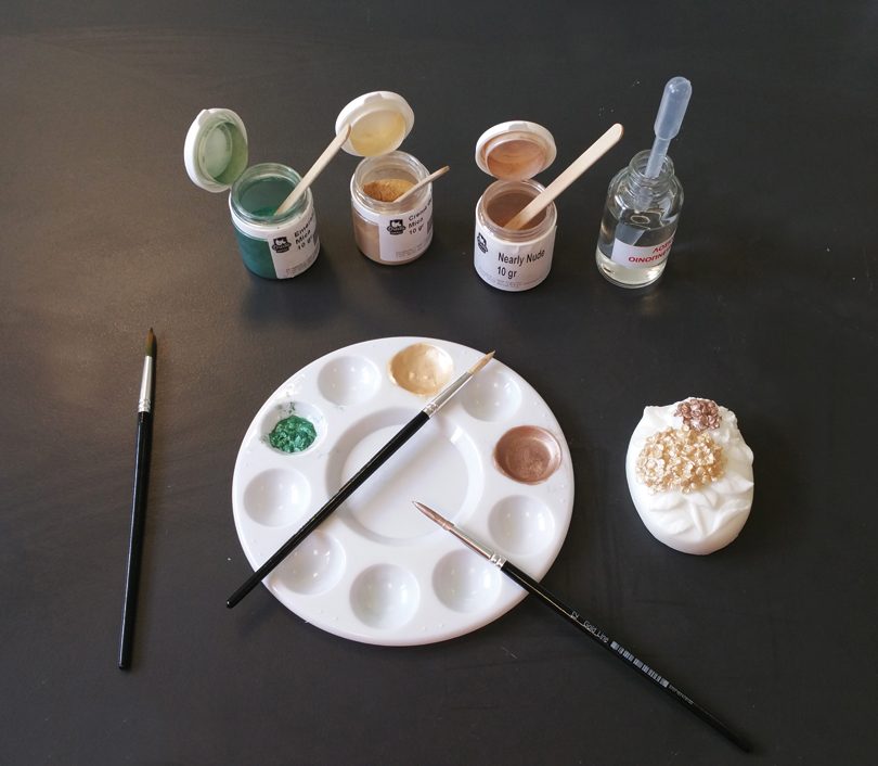 > Ετοιμάστε τα χρώματα Mica διαλύοντάς τα με την αλκοολούχο λοσιόν και βάψτε με το πινελάκι το σαπούνι γλυκερίνης.
