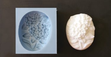 > Χυτέψτε το λιωμένο σαπούνι στο καλούπι σιλικόνης «Ορτανσίες» και ψεκάστε με αλκοολούχο λοσιόν για να εξαφανιστούν οι φυσαλίδες (που τυχόν έχουν δημιουργηθεί από το ανακάτεμα των υλικών). Περιμένετε να σκληρύνει το σαπούνι.