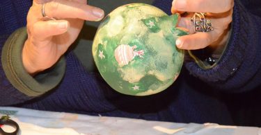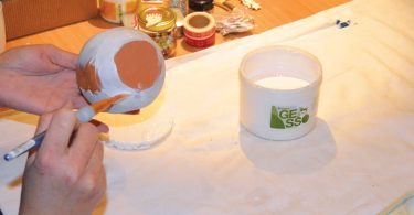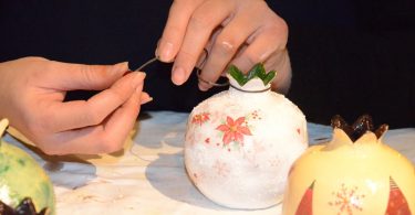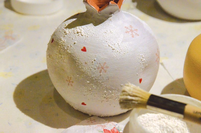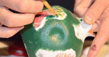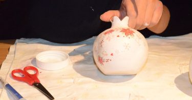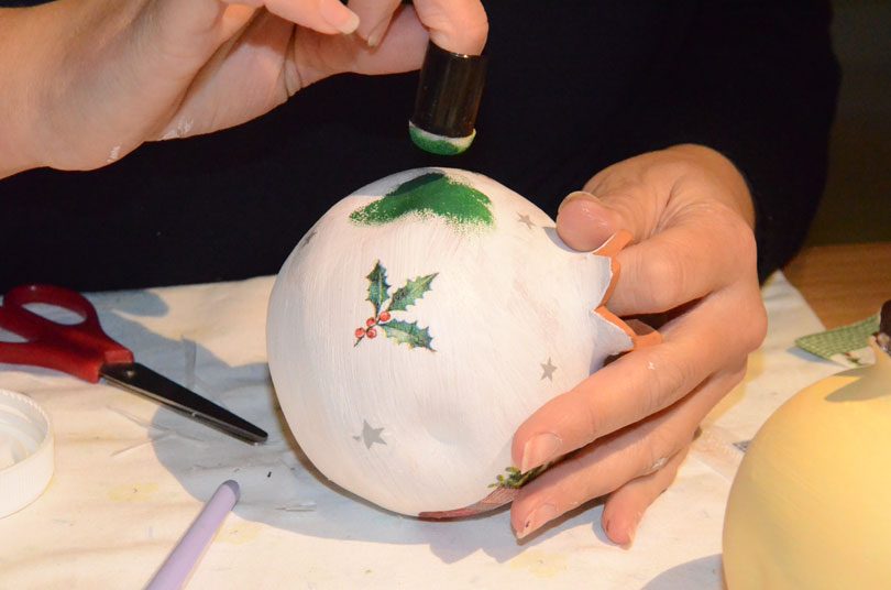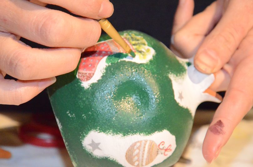 > Συνεχίστε με το προηγούμενο ρόδι που θα έχει πλέον στεγνώσει. Χρησιμοποιήστε το σφουγγαράκι ή τα δάχτυλά σας και το χρώμα που θέλετε και περάστε όλο το ρόδι ταμποναριστά γύρω από τα μοτίβα. Για να κάνετε τις λεπτομέρειες γύρω από τα μοτίβο θα χρειαστείτε λεπτό πινελάκι. Μπορείτε να τονίσετε τα περιγράμματα του μοτίβου με μεταλλικό χρώμα. Αφήστε να στεγνώσει.