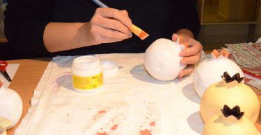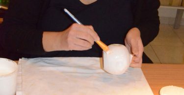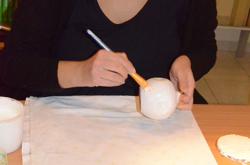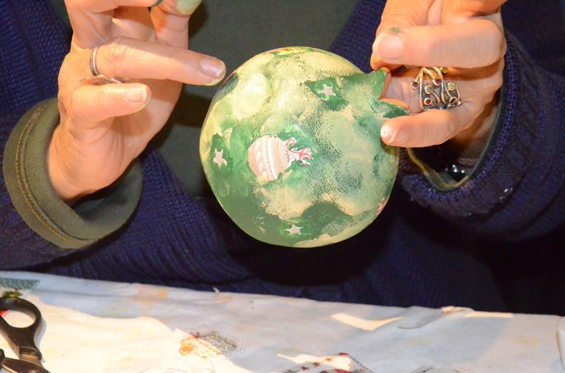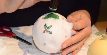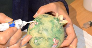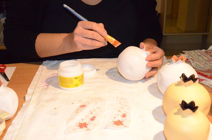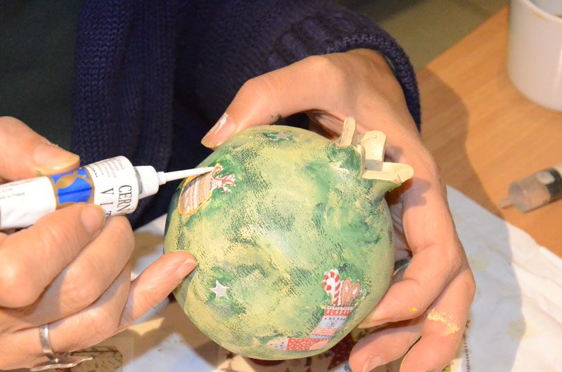 > Διαλέξτε τα μοτίβο που θα βάλετε στο ρόδι που έχετε βάψει. Κόψτε τα, συγκεντρώστε τα και κολλήστε τα όπως σας αρέσουν. Αφήστε να στεγνώσουν καλά.