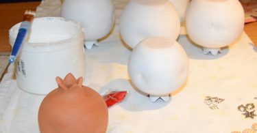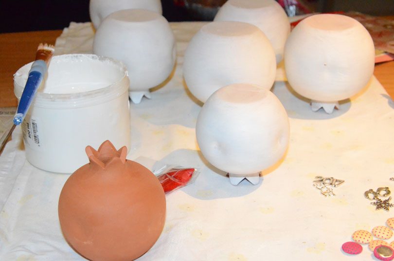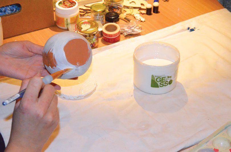 > Περάστε όλα τα ρόδια με αστάρι gesso (γκέσο) και αφήστε τα να στεγνώσουν. Αν έχετε αρκετά ρόδια, όταν περάσετε gesso και το τελευταίο ρόδι, το πρώτο ρόδι σας θα έχει ήδη στεγνώσει κι έτσι μπορείτε να συνεχίσετε με το χρώμα.
