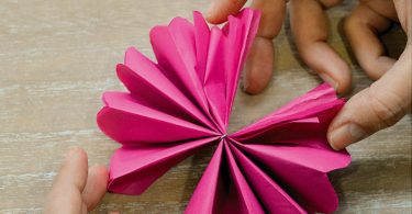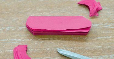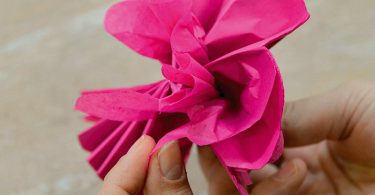 >Φτιάχνετε τα λουλούδια µε το χαρτί αφής. Κόβετε το χαρτί αφής σε λωρίδες πάχους 6 έως 15 εκ. (αναλόγως το µέγεθος του λουλουδιού που θέλετε να φτιάξετε) Τοποθετήστε 4-5 λωρίδες τη µια πάνω στην άλλη και τις διπλώνετε εναλλάξ, δηµιουργώντας µια βεντάλια. Δένετε στη µέση µε σύρµα, ανοίγετε τη βεντάλια και σηκώνετε προσεκτικά ένα-ένα τα φύλλα.