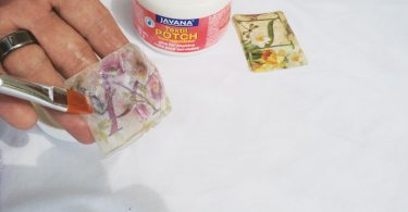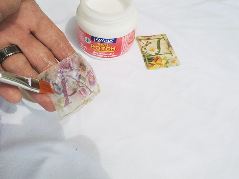 Μικρά μυστικά: Εάν θέλετε να κολλήσετε χαρτοπετσέτα επάνω σε ύφασμα, εφαρμόστε απευθείας στο ύφασμα μία στρώση κόλλας Textil Potch. Τοποθετήστε το μοτίβο -από τη χαρτοπετσέτα- και από πάνω περάστε μία ακόμη στρώση κόλλας. Στη συνέχεια το σιδερώνετε τοποθετώντας ένα πανί επάνω του, για να σταθεροποιηθεί το σχέδιο.