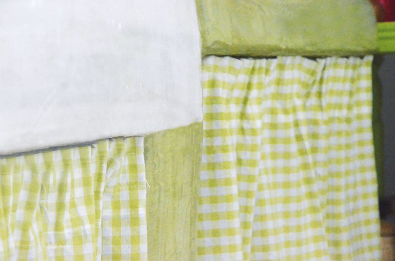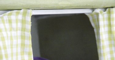 > Αν χρειαστεί (ανάλογα με το πού βρίσκεται η ούγια του υφάσματος), γαζώστε από ένα διπλό στριφωματάκι 1εκ. στο δεξί και αριστερό πλαϊνό της κουρτίνας.